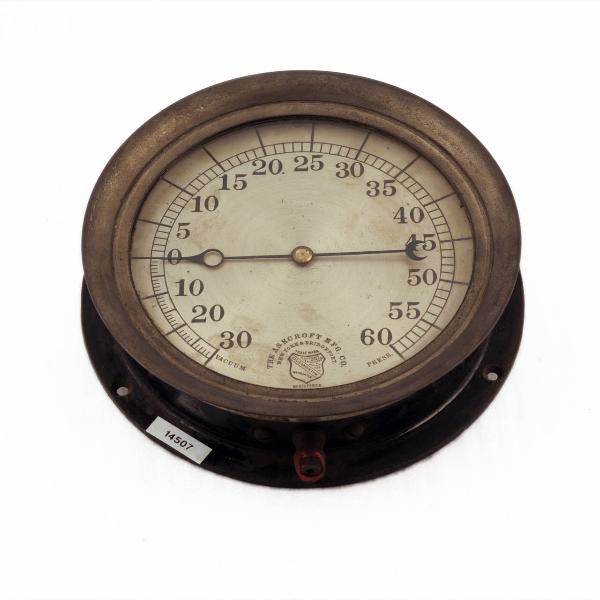 Questo strumento ha forma tipicamente circolare ed il quadrante è ricoperto e protetto da un vetro. La scala, anch'essa circolare, presenta valori crescenti in due direzioni opposte: da 30 a 0 (per misure di differenze di pressione negative rispetto alla pressione atmosferica) e da 0 a 60 (per misure di differenze di pressione positive rispetto alla pressione atmosferica), suddivisa con tacche ogni unità ed indicazione numerica ogni 10 nella prima parte ed ogni 5 nella seconda parte. La lancetta indicatrice è imperniata nel centro del quadrante. La struttura metallica, di forma cilindrica, dello strumento, termina, dalla parte opposta alla finestra di lettura, con una flangia che ne facilitava l'inserimento su un quadro di controllo generale. Sotto allo strumento è presente un connettore che serviva per il collegamento all'impianto da misurare.