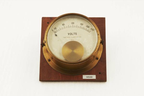 Questo strumento ha forma tipicamente cilindrica. Il quadrante occupa la superficie circolare superiore ed è protetto da un vetro. La scala, che è disposta secondo un arco di circonferenza nella parte superiore, permetteva di misurare quantità comprese tra 10 e 240 Volt ed è suddivisa con tacche ogni 5 unità ed indicazione numerica ogni 40. La lancetta indicatrice è imperniata nella parte inferiore del quadrante dove è inserita in un cilindro di ottone. La struttura metallica dello strumento termina, dalla parte opposta alla finestra di lettura, con una flangia che ne facilitava il bloccaggio su un quadro di controllo generale e attraverso la quale è ora posizionata su una tavoletta di legno quadrata (a soli fini espositivi). Lateralmente, in posizione opposta, sono presenti due serrafili a vite per il collegamento al circuito elettrico da misurare.