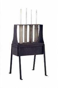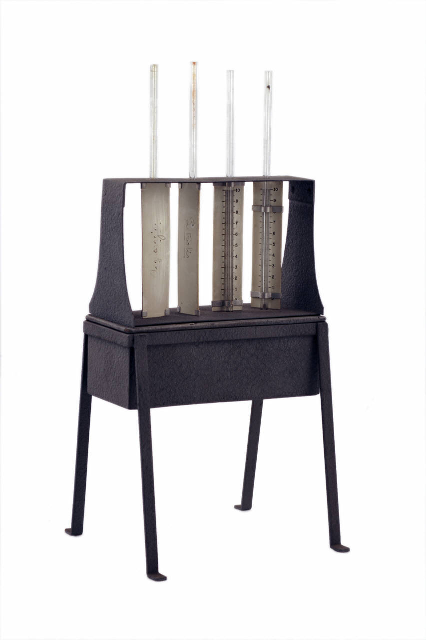 Questo apparecchio è costituito da una vaschetta rettangolare in metallo sorretta da quattro aste in metallo.\nNella vaschetta è inserito un telaio trapezoidale in metallo che serve a sostenere in posizione verticale quattro tubicini in vetro che terminano ciascuno con un bulbo.\nQuando il telaio viene appoggiato sulla vaschetta i bulbi restano all'interno di quest'ultima. All'interno dei bulbi sono contenute diverse sostanze: petrolio, acquaragia, mercurio (la quarta sostanza non è indicata).\nA ciascun tubicino in vetro è fissata una scala graduata in carta che permette misure da 0 a 10cm, con tacche ogni 0,1 e indicazioni numeriche ogni unità.