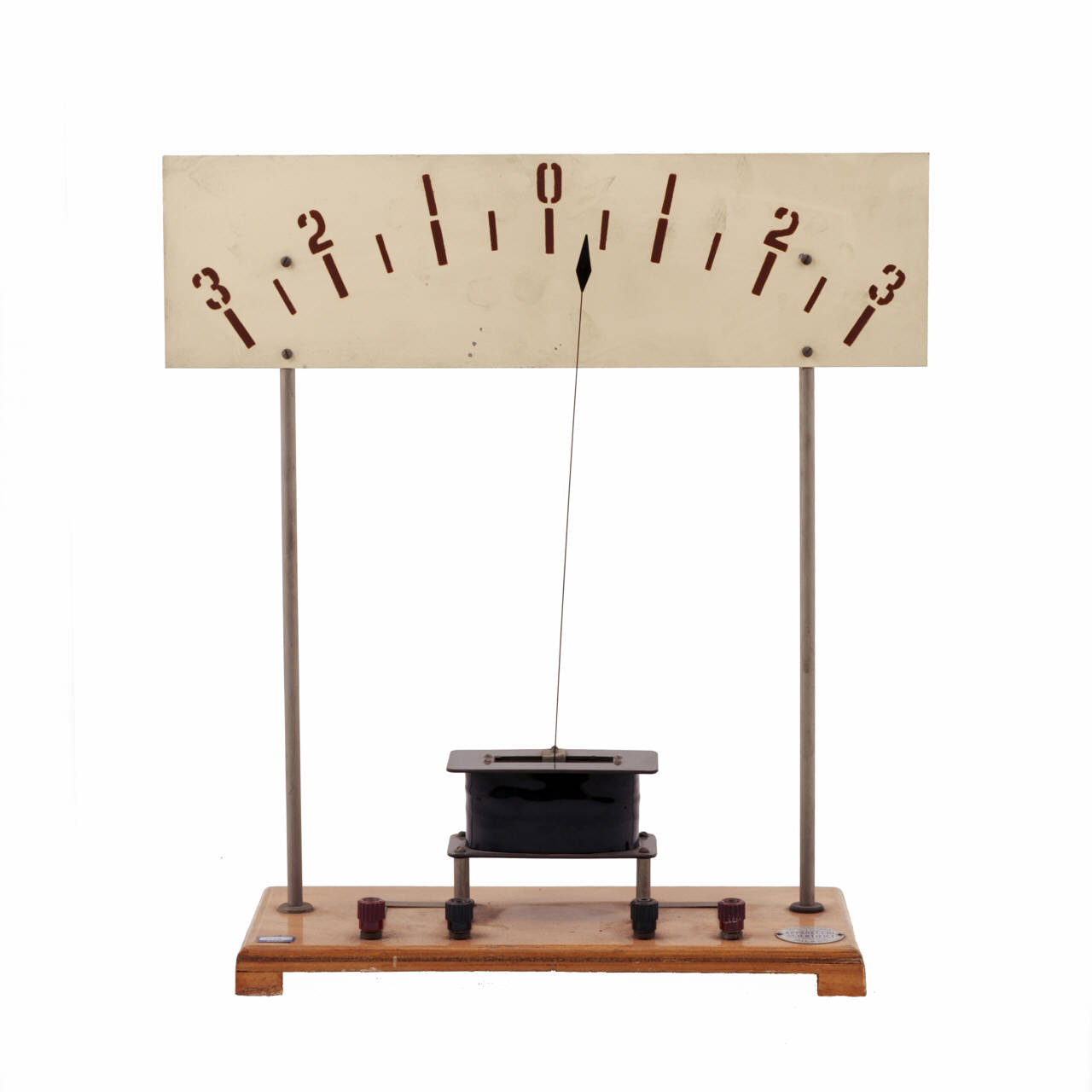 Questo dispositivo è montato su una base in legno.\nAl centro, su un supporto metallico, è fissata una bobina con gli avvolgimenti isolati da uno strato in materiale plastico. All'interno della bobina è imperniato e libero di muoversi un ago mobile.\nQuesto ago termina, dalla parte opposta, con una lancetta che indica la misura su una scala graduata con zero centrale e indicazioni numeriche 1, 2, 3 sia a sinistra che a destra, con tacche ogni 0,5 unità.\nLa scala graduata è stampata su un piccolo pannello in metallo sorretto da due aste fissate alla base in legno.\nIl sostegno della bobina è collegato, tramite conduttori metallici rigidi avvitati sulla base, a due coppie di morsetti a boccola per i collegamenti elettrici.