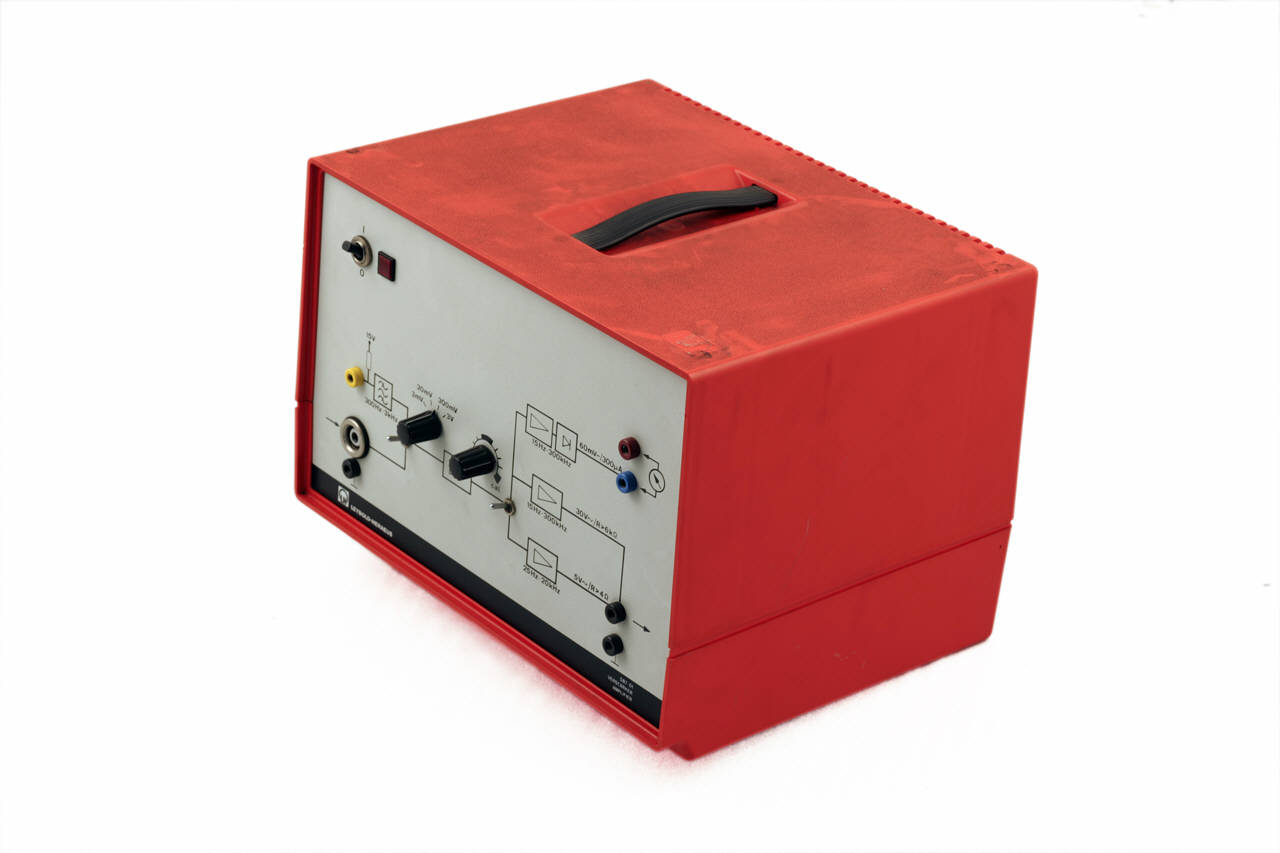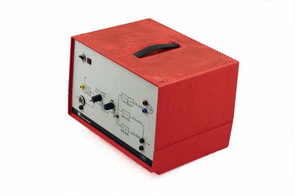 Lo strumento è ricoperto da una custodia in plastica di forma parallelepipeda e poggia su due piedini retraibili anch'essi in plastica. Superiormente è presente una maniglia in gomma per il trasporto.\nIl pannello frontale è interamente occupato dai dispositivi di regolazione e dalle boccole per i collegamenti in entrata e in uscita.\nIn alto a sinistra sono posizionati l'interruttore di rete e la relativa lampada di segnalazione.\nSotto, procedendo da sinistra verso destra, troviamo una boccola gialla da 4mm per il collegamento in entrata passante per un filtro (+15V rispetto alla messa a terra) per la connessione, ad esempio, di un fotodiodo (intervallo di frequenze 300kHz/3kHz), una boccola bianca per il collegamento diretto in entrata (resistenza in entrata 1MOhm), una boccola nera da 4mm per la messa a terra. Subito dopo troviamo un interruttore che permette di commutare su uno o l'altro ingresso.\nIl primo commutatore che segue permette di selezionare i campi di tensione alternata in ingresso (3 mV, 30 mV, 300 mV, 3 V) mentre il secondo è uno smorzatore continuo di tensione (posizionato dopo il preamplificatore) che consente di abbassare in maniera continua la tensione se si superano (fino ad un massimo di 5 volte) i valori in entrata selezionati con il primo commutatore, consentendo così la calibrazione delle tensioni in uscita prelevabili dall'amplificatore.\nUn secondo interruttore permette di selezionare il circuito in uscita e quindi le relative boccole per il prelievo dei segnali. Le boccole marrone e azzurra da 4mm in alto, forniscono tensioni continue che possono essere collegate direttamente ad eventuali strumenti di misura (60 mV e 200 µA continua, resistenza interna 200Ohm) senza messa a terra, mentre le due boccole nere da 4mm in basso, si utilizzano per il prelievo di tensioni alternate che possono essere collegate, mediante cavo coassiale (non presente) ad un oscilloscopio oppure ad un altoparlante (30V alternata, R>=6kOhm e 5V alternata, R>4 Ohm) e per la messa a terra. Gli intervalli di frequenza variano da 15Hz a 300kHz senza filtro, e da 320Hz a 3,2kHz con filtro.\nSulla faccia posteriore è situata la presa per la connessione alla rete elettrica di alimentazione di cui è presente il relativo cavo di collegamento.\nAccanto è inserito un potenziometro a vite per la regolazione della tensione di alimentazione (0, 110, 125, 150, 220, 240V). Delle prese d'aria e tre etichette riportanti il nome dell'azienda costruttrice e dati tecnici dello strumento completano il pannello posteriore.