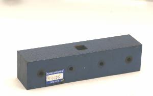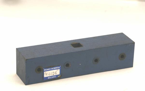 Questo giogo, in lamiera di ferro lamellata, è parte di un trasformatore scomponibile, insieme ad un nucleo a U in ferro.\nIl giogo presenta un foro al centro per permettere il passaggio del dispositivo di fissaggio al nucleo. Il perno di fissaggio è mancante.\n(Il dispositivo di fissaggio del giogo al nucleo, costituito da un'astina in metallo con piedistallo, viene inserito in un foro passante nella base del nucleo a U, passa nel foro presente sul giogo e viene serrato superiormente con una vite che comprime il giogo sul nucleo stesso, assicurando la chiusura magnetica dell'apparato.)
