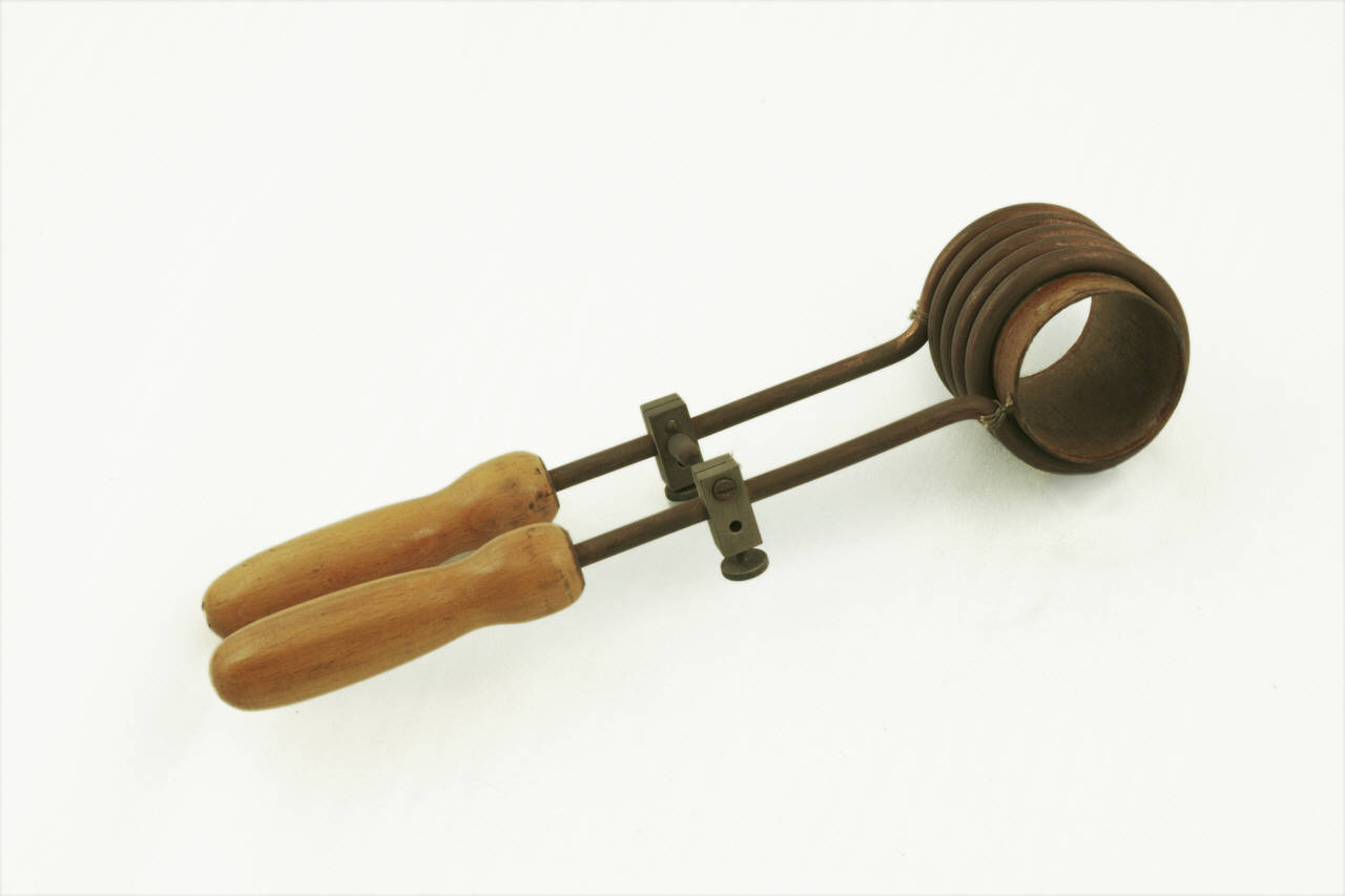 Questa bobina è costituita da un grosso filo in rame, di 8mm di spessore, avvolto in 5 spire di ca. 65mm di diametro. La risultante bobina è rivestita internamente con un manicotto isolante e le sue estremità sono provviste di manici in legno. Per chiudere il circuito elettrico, al di sopra dei manici sono avvitati dei morsetti, in cui sono fissati dei chiodi.