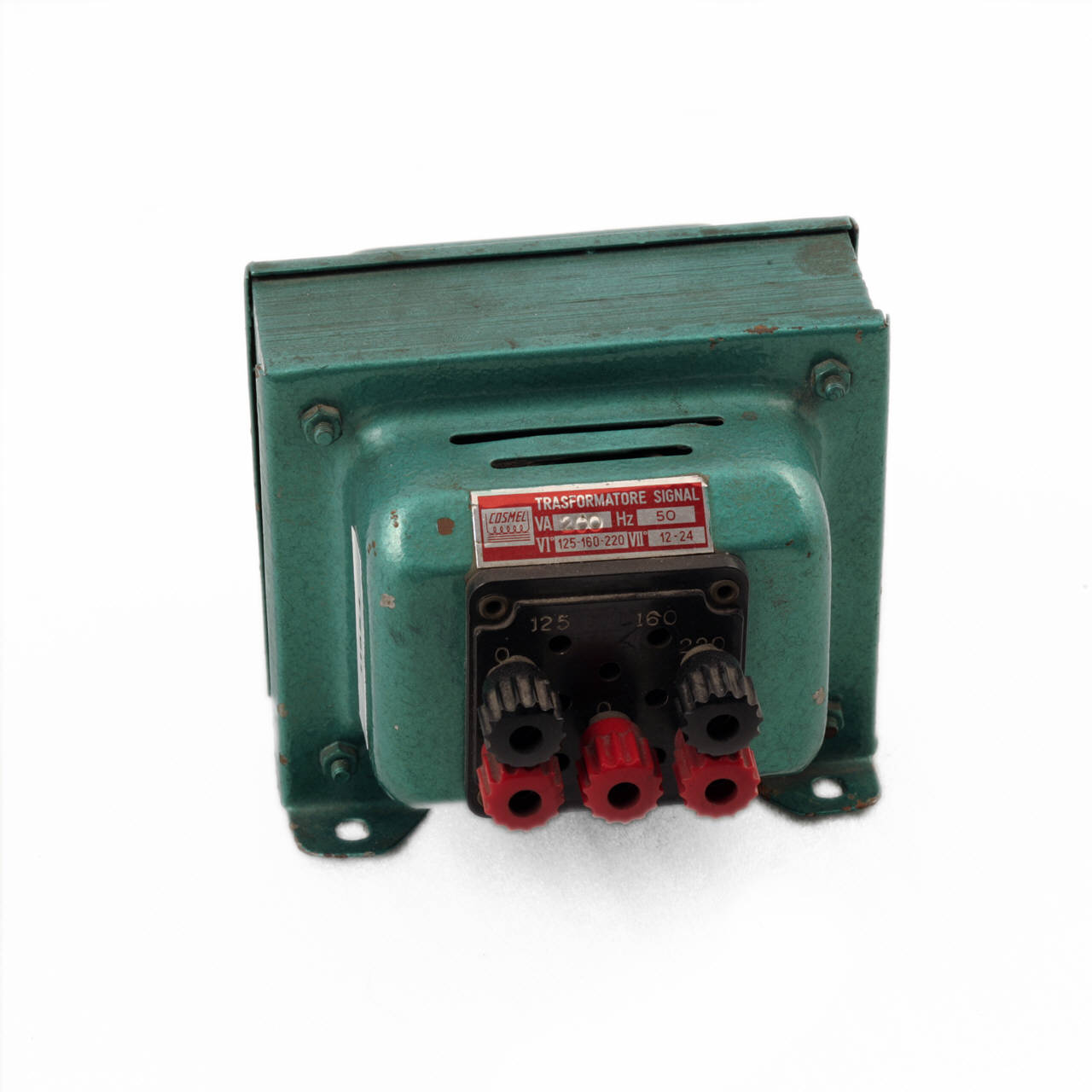 Questo trasformatore è costituito da due avvolgimenti , primario e secondario.\nLe bobine sono racchiuse in una custodia metallica di forma vagamente parallelelpipeda con quattro zanche per il fissaggio ad un tavolo di lavoro.\nLe bobine sono collegate con cinque morsetti a boccola posti su una parele frontale della custodia che permettono i collegamenti ad un generatore e ad un carico.\nSopra ai morsetti una targhetta riporta i dati tecnici dello strumento e il nome della ditta costruttrice.