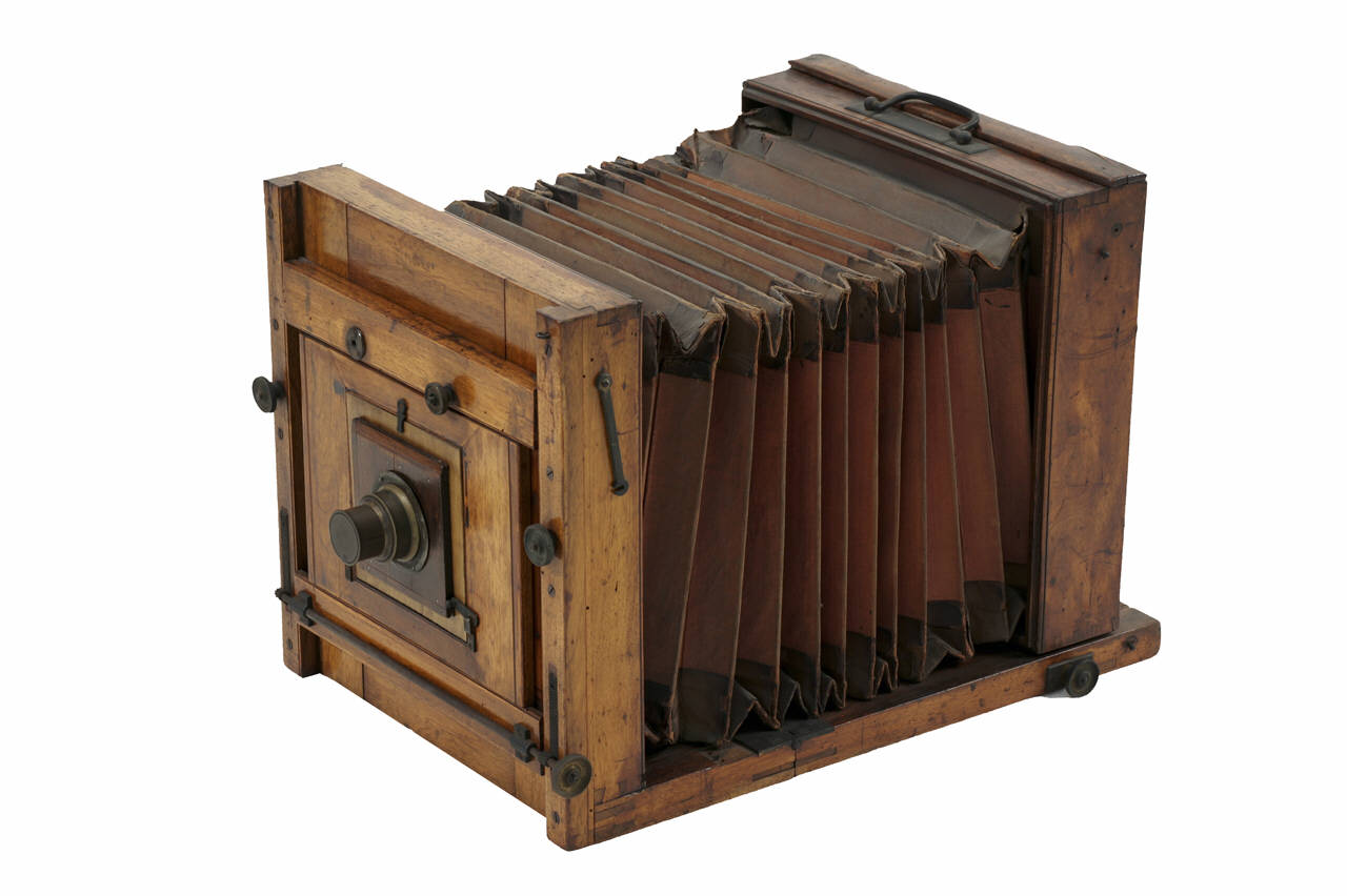 Apparecchio fotografico in legno costituito da un porta lastre per formati 13x18cm e 18x24cm e un portaobiettivo, collegati attraverso un soffietto a sezione quadrata in tela con angoli in pelle e cono girevole.\nNel porta lastre è inserito un vetro smerigliato.\nMediante una doppia cremagliera, azionata attraverso una coppia di rotelle posizionate lateralmente al porta lastra, era possibile avvicinare o allontanare vetro e obiettivo permettendo così la messa fuoco (messa a fuoco a doppia cremagliera).\nL'obiettivo è montato su un telaio in legno con regolazione sia orizzontale che verticale. \nL'obiettivo attualmente sull'apparecchio è a lente singola con diaframma fisso in metallo.\nUn tappo in metallo chiude e protegge l'obiettivo.\nL'apparecchio poggia su un ripiano in legno per il posizionamento su un cavalletto.