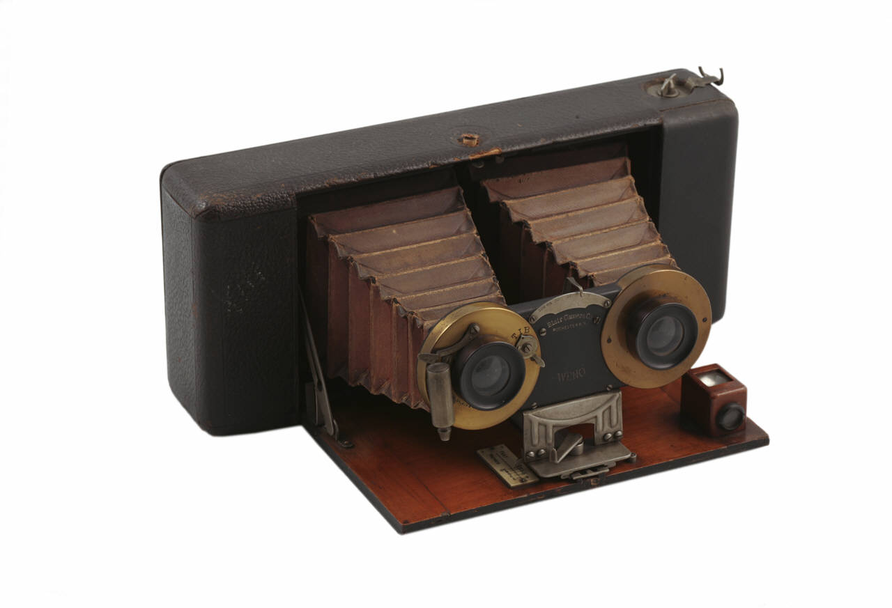Questo apparecchio è racchiuso in un parallelepipedo in legno ricoperto in pelle.\nPremendo un pulsante posto superiormente si apre lo sportello frontale dal quale si estraggono due obiettivi stereo con soffietti in pelle.\nI due obiettivo sono uniti con telaio metallico che contiene anche l'otturatore stereo.\nQuesto telaio è collegato ad una guida orizzontale posta sull'interno dello sportello che permette l'avanzamento degli obiettivi.\nUna levetta posta sul telaio, permette di fissare gli obiettivi nella posizione desiderata.\nLa distanza di posa si legge su una targhetta collocata sul coperchio che riporta tacche con distanze in metri (da 2 a 30) e piedi (da 6 a 100).\nAl centro del telaio porta obiettivi, nella parte superiore, è inserita una levetta per la regolazione dell'apertura dei diaframmi da 128 a tutto aperto.\nSull'obiettivo destro si ha la regolazione dell'otturatore: sono disponibili le tre posizioni T, I, B. ("T" corrisponde ad otturatore che resta aperto finchè non si scatta nuovamente per chiuderlo, "I" a riprese istantanee con apertura/chiusura dell'otturatore, "B" ad otturatore che resta aperto finchè il dispositivo di scatto rimane premuto).\nSullo stesso obiettivo sono inserite laleva per lo scatto dell'otturatore e la valvola per l'inserzione del comando pneumatico di scatto (guaina e pompetta sono mancanti).\nSullo sportello è fissato anche il mirino a riflessione in legno.\nIl dorso dell'apparecchio è apribile per permettere l'inserimento della pellicola in rullo (per formati 9x18cm).\nSul dorso, attraverso una finestrella rossa è visibile il numero della posa direttamente dal retro della pellicola.\nSotto all'apparecchio è presente un foro filettato per il posizionamento su cavalletto.