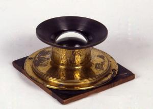 Questo obiettivo è montato su una base in legno di forma rettangolare che serviva per il posizionamento sul porta obiettivo di un apparecchio fotografico.\nL'obiettivo è costituito da due lenti molto convesse unite da un cilindro in metallo.\nAll'interno del cilindro è inserito un diaframma costituito da una lamina fissa in metallo con, al centro, un foro circolare di circa due cm di diametro.\nDalla parte della base in legno, l'obiettivo termina con una flangia circolare per l'inserimento sulla base stessa, dall'altraparte termina con uno svaso paraluce in metallo zigrinato.