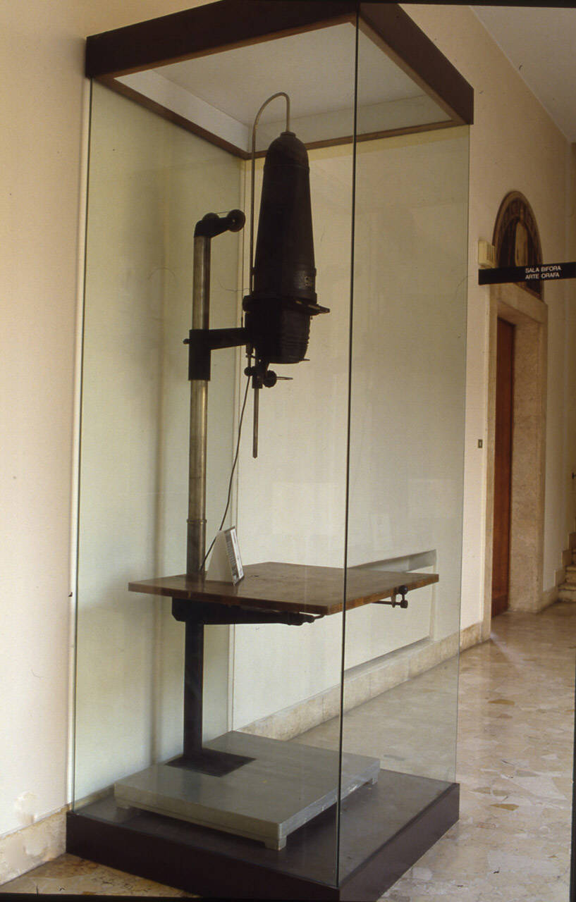 Questo dispositivo è costituito da un corpo superiore, collegato mediante una colonna rigida ad un piedistallo in metallo.\nIl piedistallo è inserito in una base in legno.\nA circa metà della colonna è inserito un piano di lavoro quadrato in legno, con altezza regolabile.\nIl corpo superiore è costituito da un apparecchio illuminante, alimentato a corrente elettrica, con lente condensatrice e un soffietto in tela con lunghezza regolabile mediante una rotella posta su un'asta verticale. \nSotto al soffietto, vincolato alla stessa asta, si trova un filtro rosso removibile.\nTra lampada e soffietto si trova un doppio telaietto in metallo, estraibile, contenente un vetro trasparente e un vetro smerigliato.\nIn questo telaietto si inserisce il negativo da ingrandire per la stampa.\nSotto al telaietto dovrebbe essere inserito un revolver portaobiettivi, attualmente mancante.