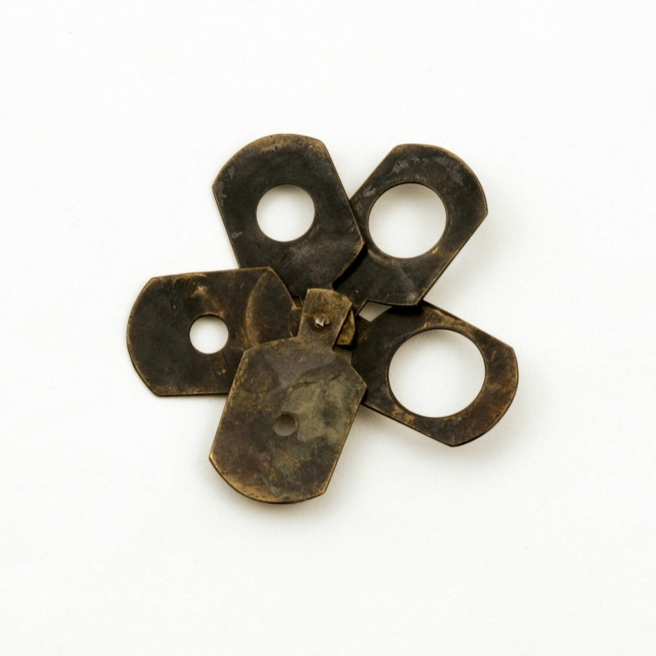 Questo set di diaframmi è costituito da cinque piccole lamine metalliche di forma all'incirca rettangolare con una parte sporgente per consentirne l'impugnatura. Al centro le lamine presentano dei fori di diversi diametri (da 0,3 a 1,4 cm circa).\nLe lamine sono tenute insieme da una vite collocata nelle impugnature.