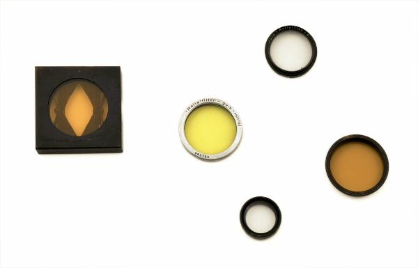 Questo set è costituito da cinque filtri fotografici di diverse dimensioni, da inserire davanti ad obiettivi fotografici.\nQuattro sono costituiti da lenti vetro montati su telai circolari in metallo da avvitare o inserire a pressione sugli obiettivi.\nDi questi due sono filtri di contrasto, uno con vetro giallo e l'altro arancione.\nAltri due hanno vetro trasparente. Le lenti trasparenti sono una piana con circonferenze concentriche incise sul vetro e l'altra convessa.\nIl quinto filtro è costituito da una lente piana arancione inserita in un telaio in metallo di forma quadrata che contiene anche un dispositivo di blocco a molla in legno e metallo per l'inserzione sull'obiettivo.