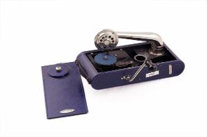 Grammofono portabile con parti scomponibili. I componenti sono contenuti in una scatola in lamiera, di colore blu craquelé, con coperchio avvitabile; i lati anteriore e posteriore sono arrotondati e presentano una maniglia in pelle nera. Svitando il coperchio, all'interno della scatola si trovano sistemati gli elementi componibili: una testina cromata, un braccio anch'esso cromato e una manovella con impugnatura in legno. Il piatto, di piccole dimensioni e ricoperto da feltro di colore blu, è azionato dal motore a molla, nascosto al si dotto del piatto. Un foro sul lato posteriore permette di inserire la manovella per la carica del motore; sul lato posteriore si trova inoltre una leva per la regolazione della velocità di rotazione del piatto.