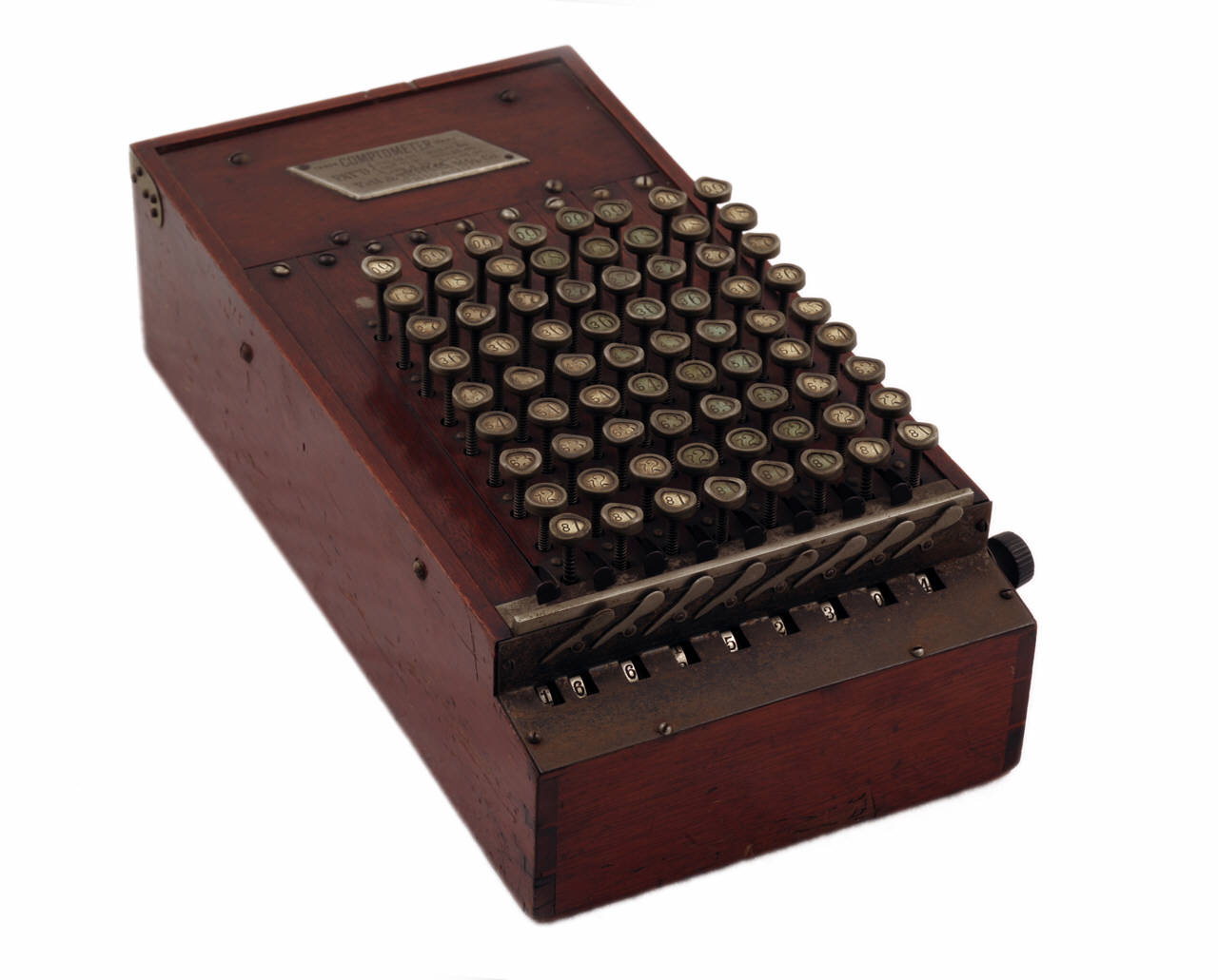 Macchina costituita da una scatola in legno, sul cui lato superiore si trova la tastiera estesa. La tastiera prevede settantadue tasti in metallo, disposti su otto colonne numerate da 1 a 9; sul bottone di ogni tasto è riportato, insieme al valore del tasto, anche il suo numero complementare. Il totalizzatore è composto da otto finestrelle poste alla base di ogni colonna. Sul fianco destro della macchina è posizionata una manopola in ebanite e una levetta in metallo per l'azzeramento del totalizzatore. All'interno della scatola risiede il meccanismo di funzionamento della macchina: i tasti di una colonna agiscono su punti diversi di una medesima leva munita anterioremente di un settore dentato che, in base al diverso abbassamento dovuto alla pressione sul tasto, comporta il movimento della ruota del numeratore alla posizione del numero digitato.