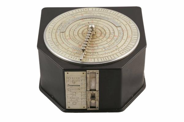 Regolo calcolatore di forma circolare posto sul piano superiore di una base in alluminio verniciata di nero. Il regolo costituisce il quadrante formato da otto corsoi ad anello, rappresentanti ognuno una variabile delle formule di calcolo, e da un anello esterno fisso, riportante una scala di valori di peso espressi in chilogrammi; su ogni corsoio sono segnati gli indici dei possibili valori della variabile. La manovella manovra i corsoi attraverso otto bottoni posti lungo il braccio. Sollevando un bottone, l'anello corrispondente rimane fermo. Sul lato anteriore è presente una finestrella scorrevole in vetro per la lettura dei risultati; a destra del binario sul quale scorre la finestrella è collocata una tabella di riferimento per i risultati. Sul fondo della regolo è posto un sostegno mobile per inclinare l'apparecchio.