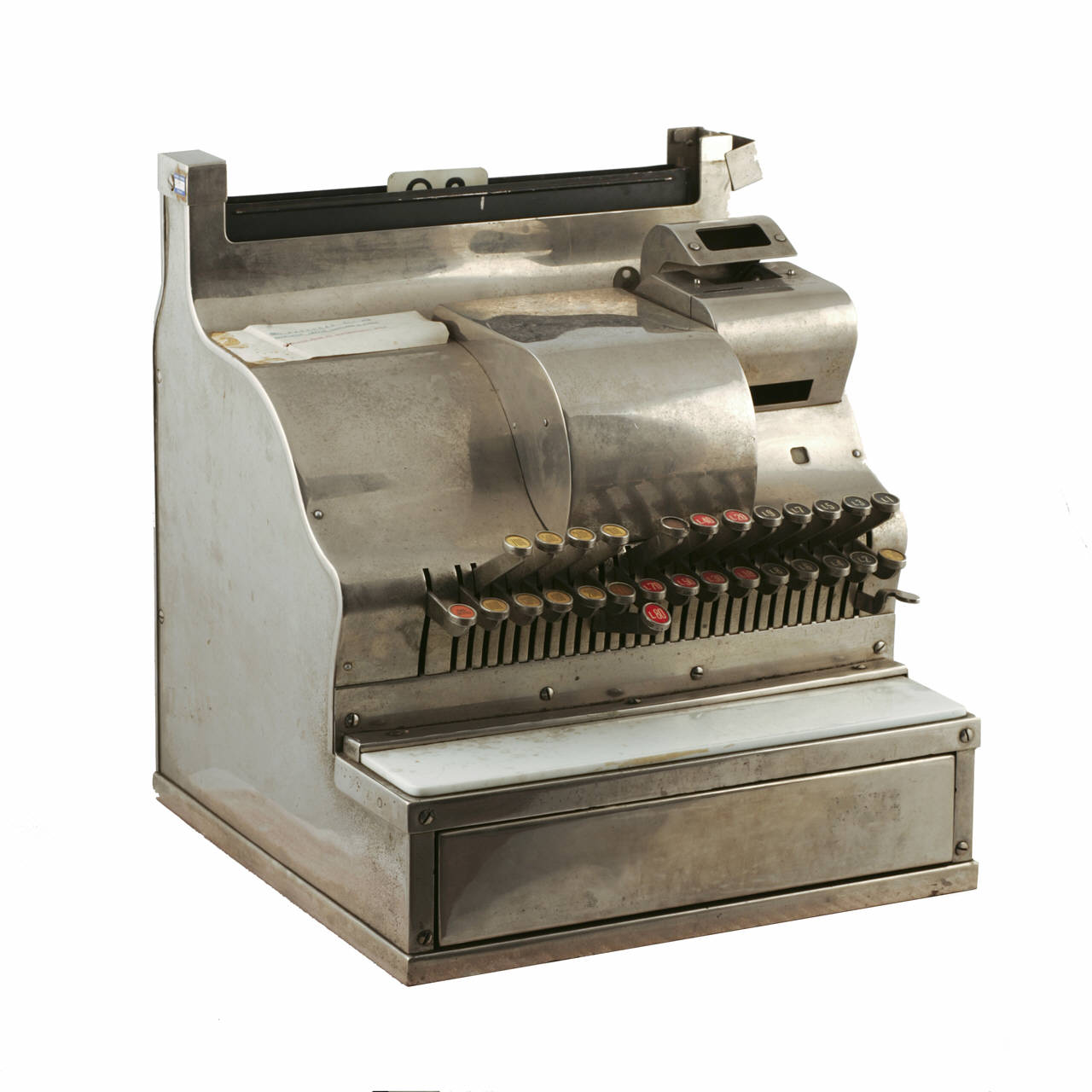 Registratore di cassa con corpo in metallo cromato e una lastra in vetro bianco collocata sul piano anteriore. L'impostazione delle cifre avviene per mezzo di una tastiera a piano; i 28 tasti presentano bottoni ovoidali, ricoperti da un foglio di celluloide. Sul lato anteriore è presente uno sportello apribile che contiene all'interno un datario e due leve per bloccare l'apertura del cassetto e per il totale registrato; alla destra di questo sportello centrale si trovano la chiave per il blocco del registratore e il dispostivo per la stampa dello scontrino. Sempre sul lato anteriore è presente un cassetto per la conservazione della cassa, apribile mediante un tasto della tastiera. Alla sommità del registratore, si trova il visualizzatore a bandiere della cifra impostata.
