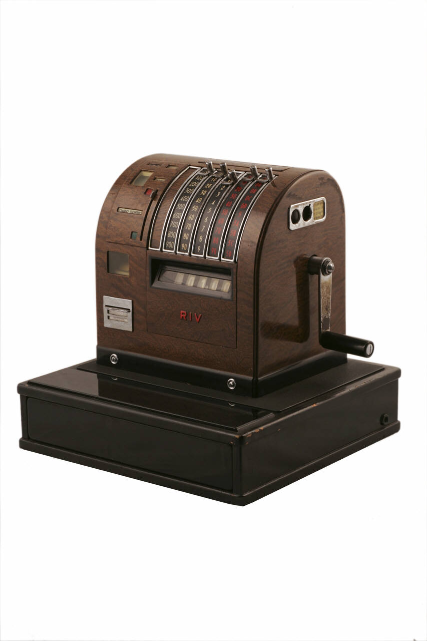 Registratore di cassa poggiante su un basamento in legno, verniciato di nero. Sul lato anteriore, il basamento presenta il cassetto per la sistemazione della valuta e un piano superiore sul quale è applicata una lastra di vetro nero. Il corpo del registratore è in metallo, verniciato ad imitiazione delle venature del legno. L'impostazione delle cifre da registrare avviene mediante cinque leve, correnti in altrettante feritoie sul lato anteriore. Alla sinistra delle leve si trovano i comandi di stampa della ricevuta. Il registratore è dotato di due visualizzatori del totale; nel lato anteriore, l'indicatore è posto al di sotto della tastiera, mentre l'indicatore per il cliente si trova nella parte superiore del lato posteriore. Alla sommità del registratore, uno sportello apribile racchiude l'indicatore del totale di cassa. Sul fianco destro del registratore di cassa si trova la manovella, con impugnatura in ebanite, per l'esecuzione della registrazione. Ad ogni rivoluzione della manovella, il cassetto si apre automaticamente ed un campanello avverte dell'apertura.