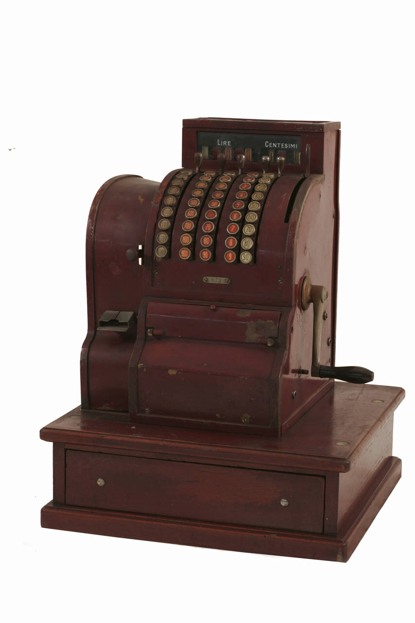 Registratore di cassa meccanico, poggiante su basamento in legno dotato di cassetto per la sistemazione della valuta. Il corpo della macchina è in metallo, verniciato ad imitazione delle venature del legno. L'impostazione delle cifre da registrare avviene mediante cinque leve, correnti in altrettante feritoie sul lato anteriore; alla sinistra di ogni feritoria è posta una serie di bottoni con l'indicazione dei valori da impostare. Sul lato anteriore si trova uno sportello apribile per la lettura del totalizzatore di cassa. Alla sommità del registratore di cassa si trovano i totalizzatori dell'importo, coperti da una lastra di vetro; sul lato anteriore è presente una leva per l'azzeramento del totalizzatore. Sul fianco sinistro del registratore di cassa è posto l'apparato per la stampa della ricevuta. Sul fianco destro del registratore di cassa si trova la manovella per l'esecuzione della registrazione. Ad ogni rivoluzione della manovella, il cassetto si apre automaticamente ed un campanello avverte dell'apertura.