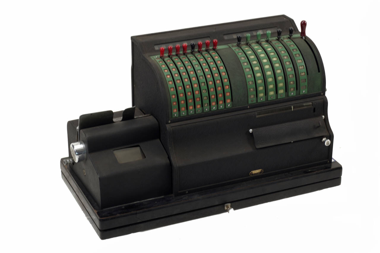 Macchina contabile elettromeccanica con basamento in legno dotato di un doppio cassetto per la sistemazione della valuta. Il corpo della macchina è in metallo, verniciato di nero, con superficie craquelé. L'impostazione dell'importo avviene mediante un doppio sistema di leve sul lato anteriore. A destra di trova un gruppo di sei leve con impugnature in materiale plastico di colore nero e verde; a sinistra si trova un secondo gruppo di leve con impugnature di colore nero e rosso. Ad ogni gruppo di leve corrisponde un distinto totalizzatore dell'importo posto sulla sommità della macchina. Sul lato anteriore è presente inoltre uno sportello che racchiude il totalizzatore di cassa e degli indicatori di controllo delle operazioni. La manovella per l'esecuzione della registrazione è da applicare sul fianco destro. Sul lato sinistro è installato l'apparato per la stampa del resoconto. Dal fianco sinistro inoltre esce il cavo elettrico per l'allacciamento alla rete di alimentazione.