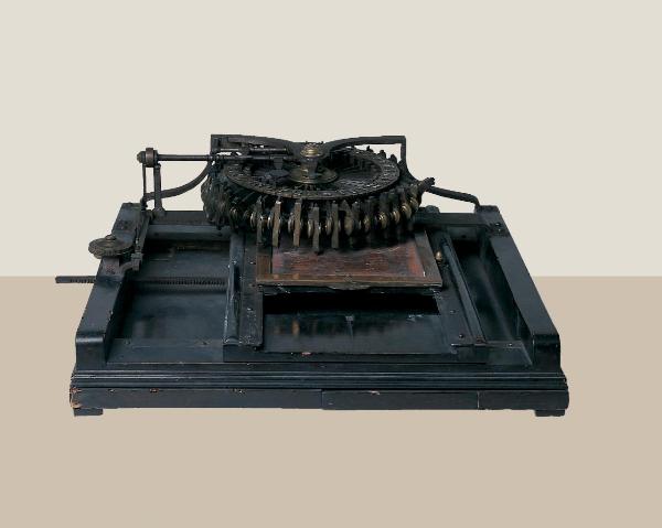 La macchina è costituita da un supporto rettangolare di legno di colore nero su cui è inserita una guida per il telaio a spostamento automatico dentro al quale si posiziona il foglio per la scrittura. Sopra il telaio, permette la scrittura un disco movibile di ferro e ottone munito di 3 tasti contenente martelletti riportanti lettere maiuscole e minuscole ribaltabili manualmente. Le lettere sono indicate in rilievo sulla corona esterna della ruota mentre i numeri sulla corona interna. I bracci a forma di ali di gabbiano posizionati sopra il disco, riportano il nome del costruttore Giovanni Battista Marchesi (Lodi).