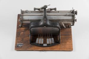 La macchina si compone di rullo e tastiera munita di 6 tasti in ferro e di un tasto spaziatore; il modello si trova appoggiato sopra un basamento di legno di misura rettangolare.