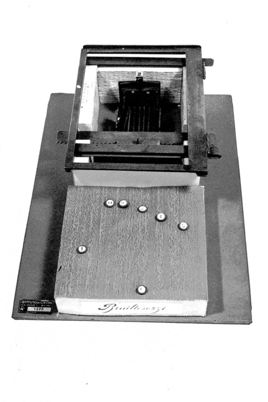 E’ un prototipo di macchina per scrivere per non vedenti, presenta una tastiera per l’uso di una sola mano grazie alla disposizione dei tasti che vengono “battuti” dalla 5 dita con una unica variante per il dito indice sul tasto spaziatore. La sesta battuta viene data con il palmo della mano. \nFra i pregi di questa macchina si enunciano: l'uso del foglio doppio, l'incisione o interpunto (pagina e rovescio della stessa), tavoletta a cerniera munita di squadra per inserire il foglio perfettamente dritto, incisione direttamente leggibile. \nIl poter usare una sola mano per la scrittura è molto importante per il non vedente in quanto con la mano sinistra può seguire il testo che vuol ricopiare. Attualmente il prototipo di questa macchinetta risulta disperso. \n