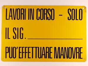 Cartello rettangolare recante scritta in nero, ottenuta mediante l'utilizzo della serigrafia, su fondo giallo. Presenta quattro fori agli angoli atti al fissaggio.
