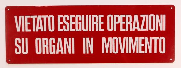 Cartello rettangolare con scritta in bianco, ottenuta mediante l'utilizzo della serigrafia, su fondo rosso. Presenta quattro fori agli angoli atti al fissaggio.\n\n