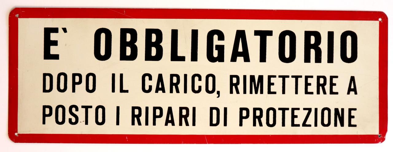 Cartello rettangolare riquadrato, con bordo in rosso e scritta in nero, ottenuti mediante l'utilizzo della serigrafia, su fondo bianco. Presenta quattro fori agli angoli atti al fissaggio.\n