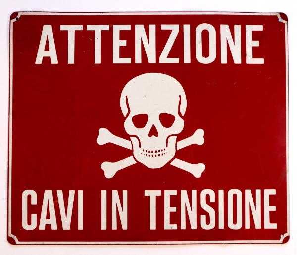 Cartello rettangolare con pittogramma e scritta in bianco, ottenuta mediante l'utilizzo della serigrafia, su fondo rosso. Presenta quattro fori negli angoli atti al fissaggio.\n