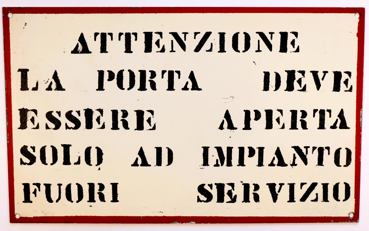 Cartello rettangolare riquadrato, con bordo in rosso e scritta in nero, ottenuti mediante l'utilizzo della verniciatura con mascherina, su fondo bianco. Presenta quattro fori agli angoli atti al fissaggio.