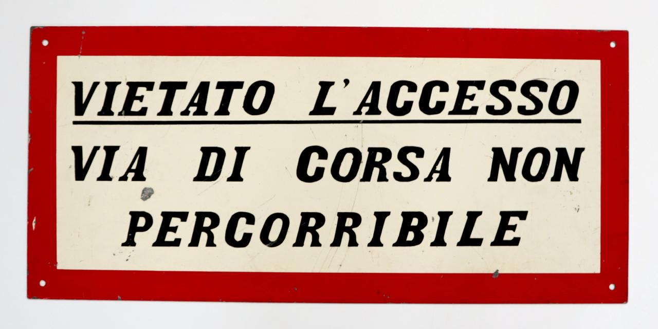 Cartello rettangolare riquadrato, con bordo in rosso e scritta in nero, ottenuti mediante l'utilizzo della verniciatura con mascherina, su fondo bianco. Presenta quattro fori agli angoli atti al fissaggio.\n
