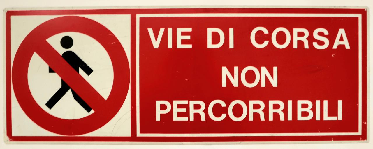 Cartello rettangolare riquadrato in rosso, suddiviso in due campi, recante pittogramma (a sinistra) su fondo bianco, e scritta bianca (a destra) su fondo rosso, ottenuti mediante l'utilizzo della serigrafia. Presenta quattro fori negli angoli atti al fissaggio.\n