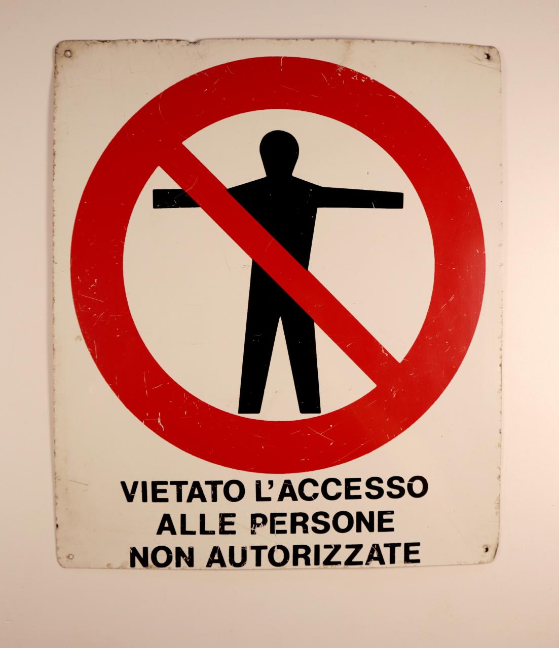 Cartello rettangolare recante, nella parte superiore, la riproduzione di un cartello rotondo con bordo esterno in rosso e al centro un pittogramma in nero su fondo bianco, attraversato da una linea rossa, ottenuti mediante l'utilizzo della serigrafia. Scritta in nero nella parte inferiore. Presenta quattro fori agli angoli atti al fissaggio.\n\n\n