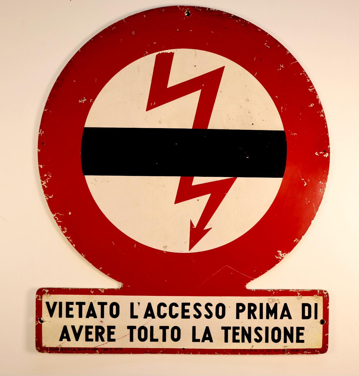 Cartello composto da una parte superiore rotondo con bordo esterno in rosso e al centro un pittogramma in rosso su fondo bianco attraversato da una linea nera, e nella parte inferiore, un rettangolo riquadrato in rosso con scritta in nero su fondo bianco. La grafica è ottenuta mediante l'utilizzo della serigrafia. Presenta un foro nella parte superiore e due fori ai lati del rettangolo atti al fissaggio.\n\n\n\n