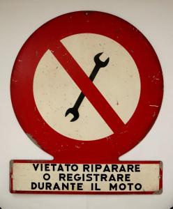 Cartello composto da una parte superiore rotonda con bordo esterno in rosso e al centro un pittogramma in nero su fondo bianco attraversato da una linea rossa, e nella parte inferiore, un rettangolo riquadrato in rosso con scritta in nero su fondo bianco. La grafica è ottenuta mediante l'utilizzo della serigrafia. Presenta tre fori lungo il bordo nella parte superiore e due fori ai lati del rettangolo atti al fissaggio.\n\n\n
