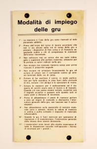Cartello rettangolare che indica le modalità di utilizzo delle gru attraverso varie disposizioni scritte con inchiostro nero su fondo bianco. Presenta quattro fori in alto e in basso atti al fissaggio.\n\n