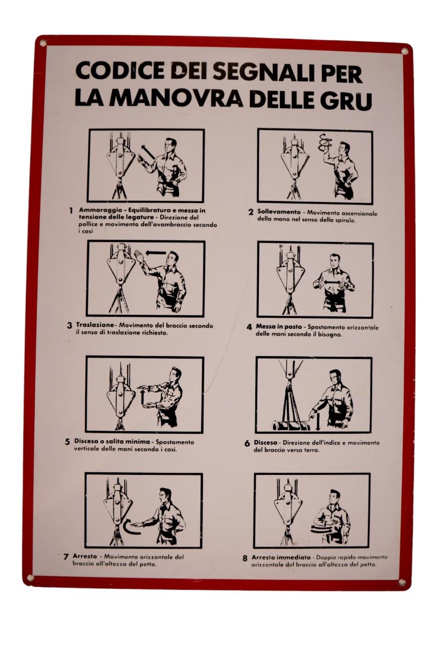 Cartello rettangolare riquadrato, con bordo in rosso, scritte e disegni esplicativi in nero, ottenuti mediante serigrafia, su fondo bianco. Presenta quattro fori agli angoli atti al fissaggio. \n\n\n\n\n