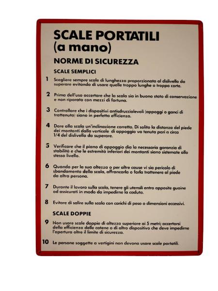 Cartello rettangolare riquadrato, con bordo in rosso e scritte in nero, ottenuti mediante serigrafia su fondo bianco. Presenta quattro fori agli angoli atti al fissaggio.\n\n\n\n\n\n