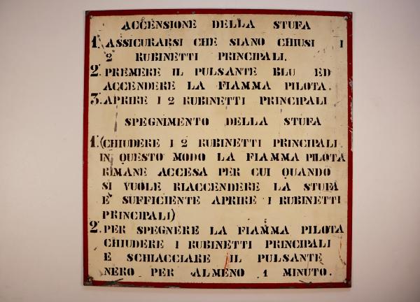 Cartello quadrato riquadrato, con bordo in rosso e scritte in nero, ottenuti mediante l'utilizzo della verniciatura con mascherina, su fondo bianco. Presenta quattro fori agli angoli atti al fissaggio. \n\n\n\n