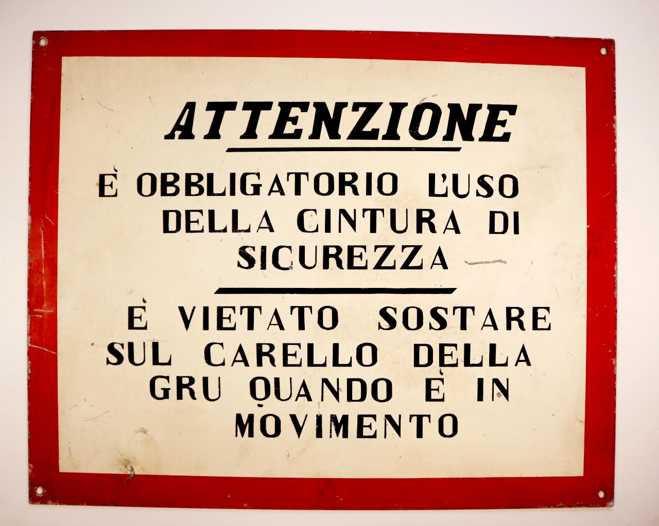 Cartello quadrato riquadrato, con bordo in rosso e scritte in nero, ottenuti mediante l'utilizzo della verniciatura con mascherina, su fondo bianco. Presenta quattro fori agli angoli atti al fissaggio. \n\n\n\n