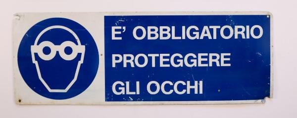 Cartello rettangolare, suddiviso in due campi, recante pittogramma (a sinistra) in bianco su fondo circolare blu, e scritta (a destra) in bianco su fondo blu, ottenuti mediante l'utilizzo della serigrafia. Presenta quattro fori negli angoli atti al fissaggio.
