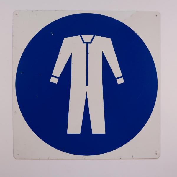 Cartello quadrato con pittogramma centrale in bianco su fondo circolare blu, ottenuto mediante l'utilizzo serigrafia. Presenta quattro fori agli angoli atti al fissaggio.