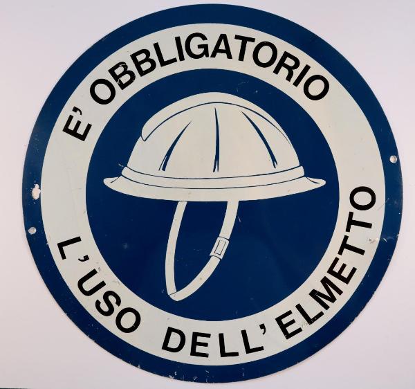 Cartello rotondo con bordo esterno in blu, scritta in nero su fondo bianco, nel bordo più interno, e pittogramma centrale in bianco su fondo circolare blu, ottenuti mediante l'utilizzo della serigrafia. Presenta due fori laterali atti al fissaggio.\n\n