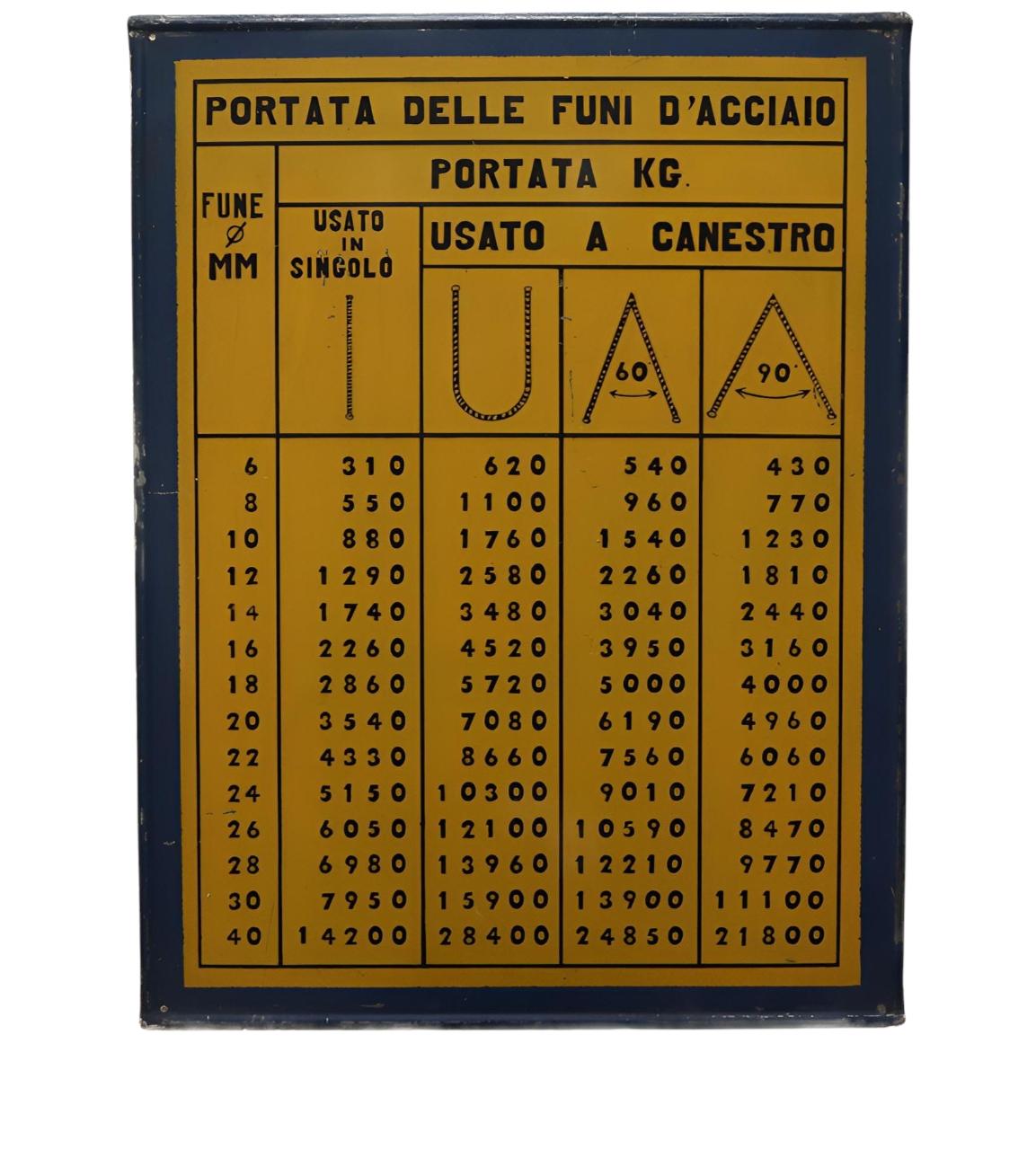 Cartello rettangolare riquadrato, con bordo in blu, recante pittogrammi e scritte in nero, ottenuti mediante l'utilizzo della verniciatura con mascherina, su fondo giallo. Presenta quattro fori agli angoli del rettangolo atti al fissaggio.\n\n