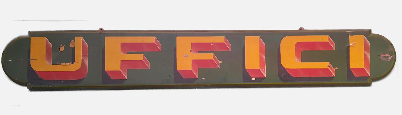 Cartello rettangolare, recante scritta in giallo, ottenuta mediante l'utilizzo della verniciatura con mascherina, su fondo verde. Presenta due ganci nella parte superiore atti al fissaggio.\n\n