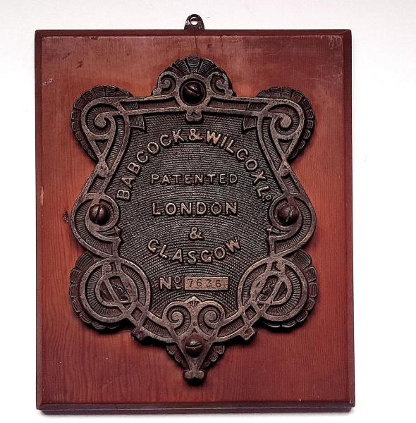 Lastra in metallo con scritte e decorazioni in rilievo, applicata su un supporto rettangolare in legno. Presenta gancio nella parte superiore atto al fissaggio.\n\n\n