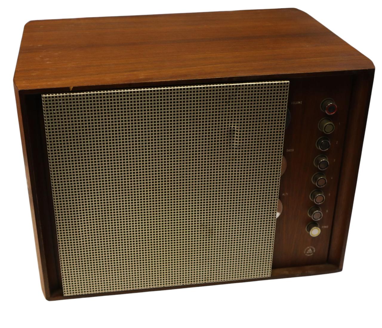 Apparecchio stereofonico per la ricezione della filodiffusione, con amplificatori, altoparlanti, presa fono e uscita registratore. Sul fronte anteriore, a destra, sono posizionati i tasti corrispondenti ai canali.\n\n