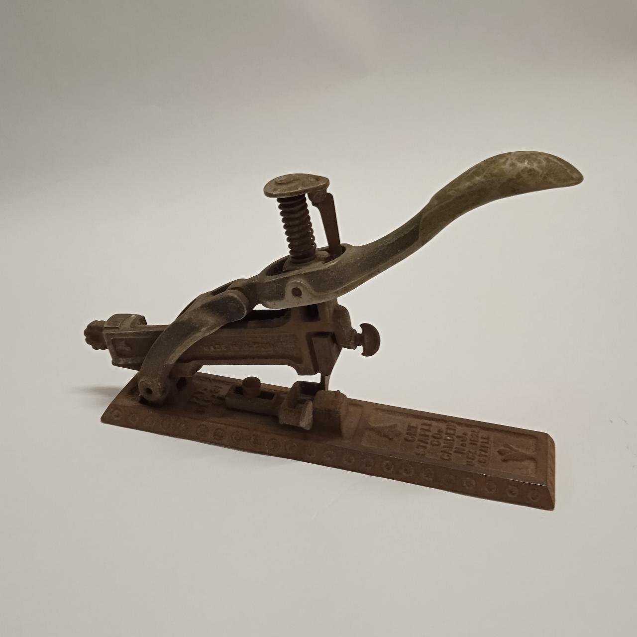 Attrezzo in ghisa costituito da una base rettangolare cui è agganciato il meccanismo superiore comprendente il contenitore per le graffette e la leva a maniglia.