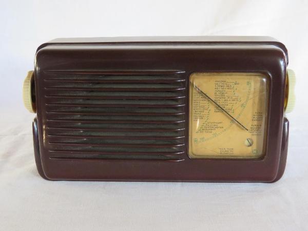 Apparecchio radio compatto ad andamento orizzontale, con mobile in bachelite marrone e bordi arrotondati. L'altoparlante magnetodinamico occupa la parte sinistra della parete frontale ed è protetto da un tessuto e da listarelle di bachelite. La scala parlante a settore circolare è posizionata sulla parte destra e riporta indicate le scale delle lunghezze d'onda e le località. Sui due lati sono presenti due grandi manopole bianche per accensione/spegnimento/regolazione del volume e per la sintonizzazione.\nSul retro, sotto ad una griglia protettiva, è visibile il circuito supereterodina ZF/IF 455KHz a 5 valvole con circuiti in modulazione di ampiezza (AM). Dal retro fuoriescono il filo dell'antenna e il cavo di alimentazione.