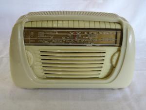 Apparecchio radio compatto ad andamento orizzontale, con mobile in bachelite colore bianco avorio e forma arrotondata. L'altoparlante magnetodinamico si trova al centro della parete frontale ed è protetto da listarelle in bachelite. La scala parlante è stampata su un rettangolo di plastica trasparente inserito longitudinalmente nella parte alta della parete frontale e riporta le lunghezze d'onda e le località (stazioni italiane ed estere). Sotto alla scala di sintonia e inserite nel mobile dell'apparecchio si trovano due rotelle bianche visibili solo parzialmente, per accensione/spegnimento e regolazione del volume e per la sintonizzazione.\nIl retro presenta diverse aperture per l'aerazione ed aprendolo si trovano il circuito supereterodina ZF/IF 455KHz a 5 valvole con 6 circuiti accordati in modulazione di ampiezza (AM) e l'altoparlante. Dal retro fuoriescono il filo dell'antenna e il cavo di alimentazione.