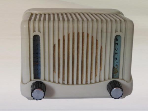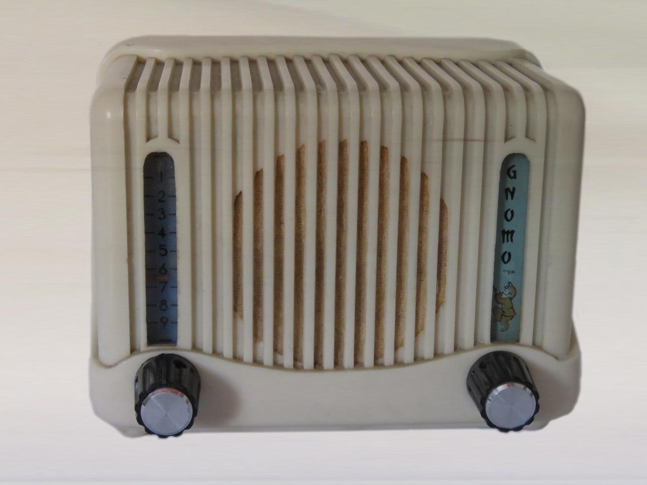 Apparecchio radio compatto di piccole dimensioni con mobile in materiale plastico bianco, ad andamento orizzontale e profili arrotondati con una modanatura che corre lungo il profilo esterno. Al centro della parete frontale, in un foro, è inserito l'altoparlante magnetodinamico circolare protetto da una tela e una griglia che fa parte del mobile dell'apparecchio. Ai lati dell'altoparlante sono presenti due fessure verticali con illuminazione dall'alto: quella di sinistra contiene la scala parlante in plastica con indicazioni numeriche e indice scorrevole, quella di destra contiene nome della radio e disegno di uno gnomo. Sotto alle fessure sono inserite due manopole per accensione/spegnimento/regolazione volume e sintonizzazione.\nSul retro, sotto ad un pannello protettivo con aperture per l'aerazione, è visibile il circuito reflex supereterodina accordato a due valvole con autotrasformatore e raddrizzatore al Selenio.\nSul retro sono presenti una presa per antenna, il cambiatensione e il cavo di collegamento alla rete di alimentazione.